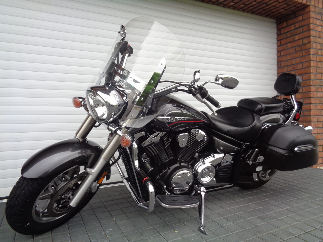 VÝBAVA: originál plexi štít, značkový padací rám s předkopy, opěrka spolujezdce, laděná koncovka výfuku od Cobry – dunivý zvuk, orig. kožené kufry na pevné konstrukci, zamykatelné – klíč shodný se spínačkou, dále chromovaný kryt řemenu, chromovaná zásuvka 12V na řídítkách … přidám značkový textilní magneticky tank-bag na nádrž.