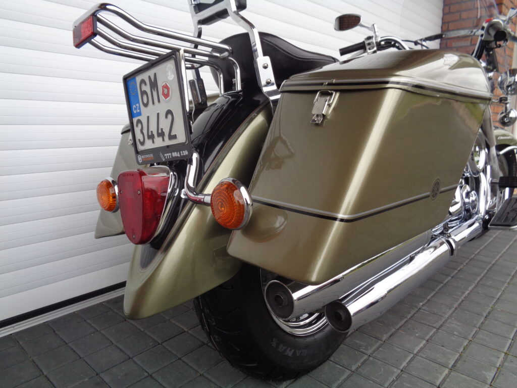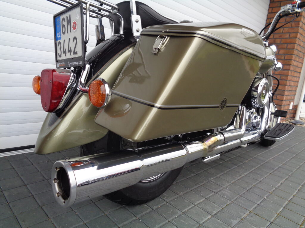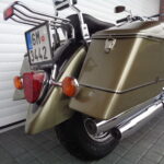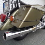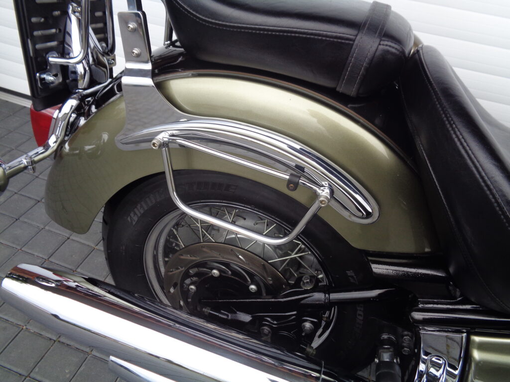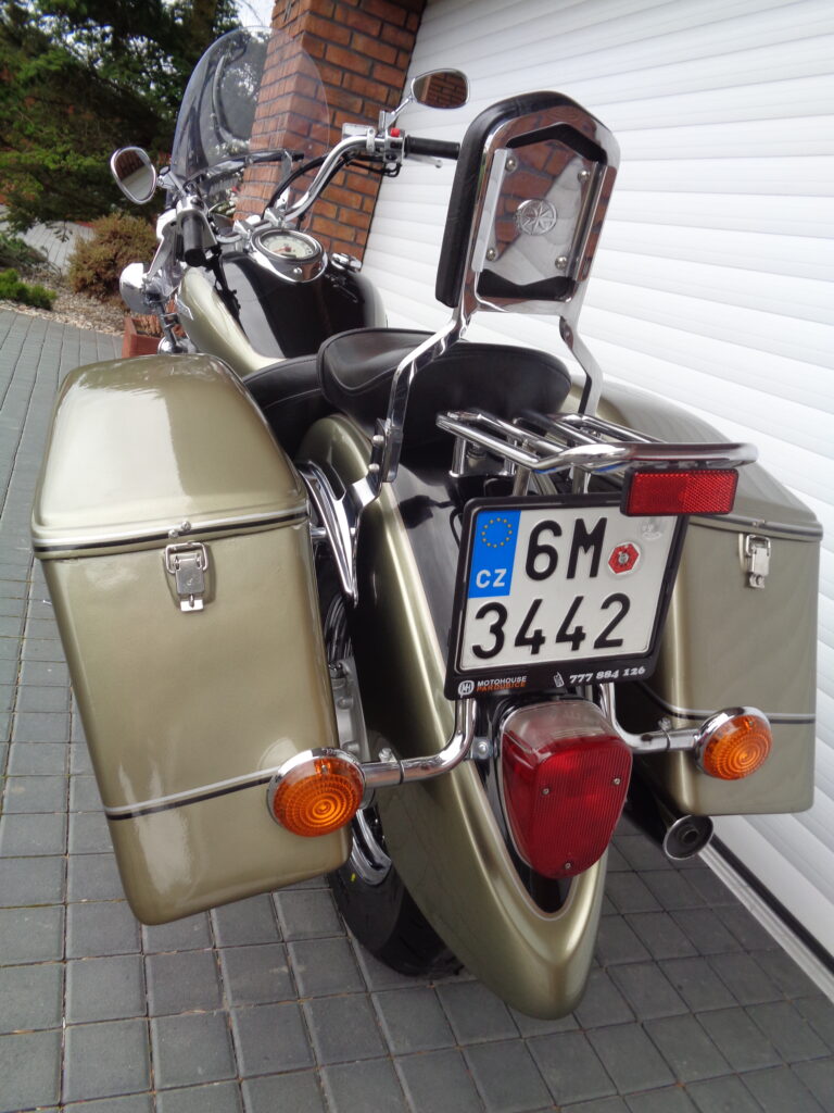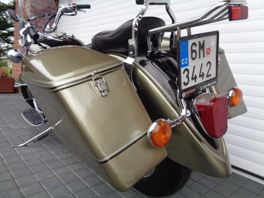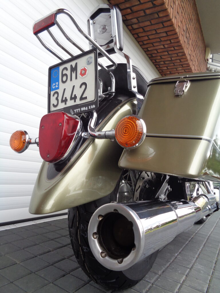 VÝBAVA: chromovaný rám předního blatníku, přídavná světla, originál plexi štít – výškově stavitelný, přední padací rámy, rychloupínací skořepinové kufry v barvě – zamykatelné + zamykatelné k motu – 2x klíč. Dále opěrka spolujezdce s nosičem, okrasné kryty rámu, značkový laděný výfuk – hluboký dunivý zvuk, / přední svod shodný pro oba výfuky /, stínítko hl. světla, přidám značkový elektronický zámek na kotouč +nový zámek kufru … .