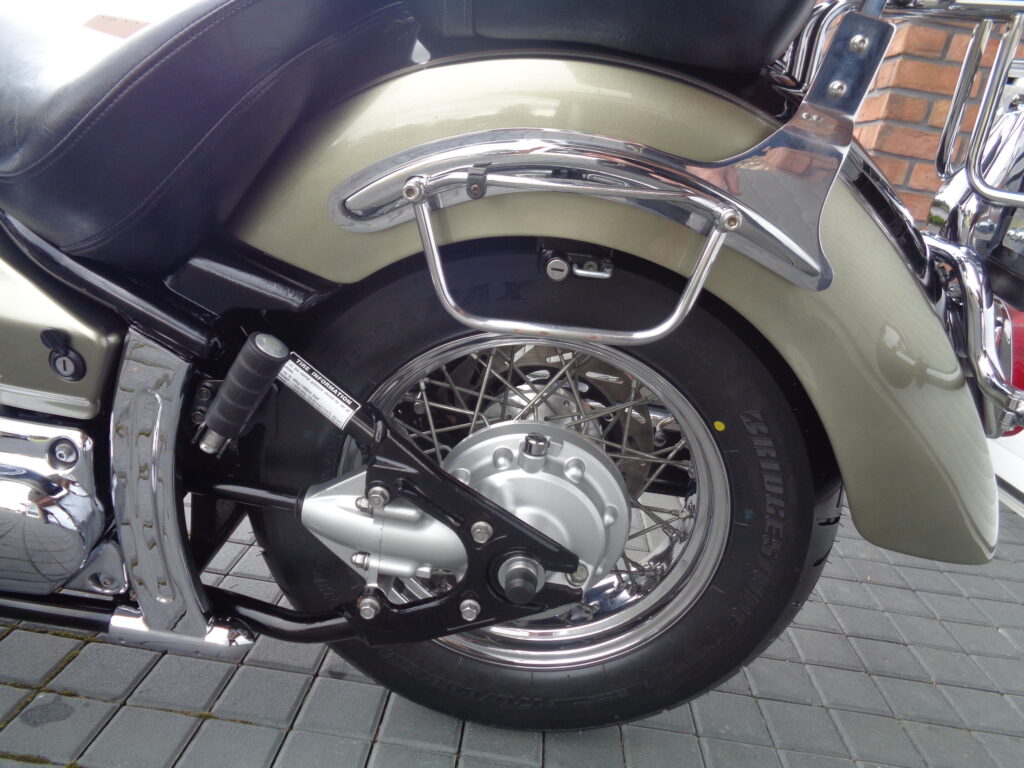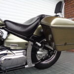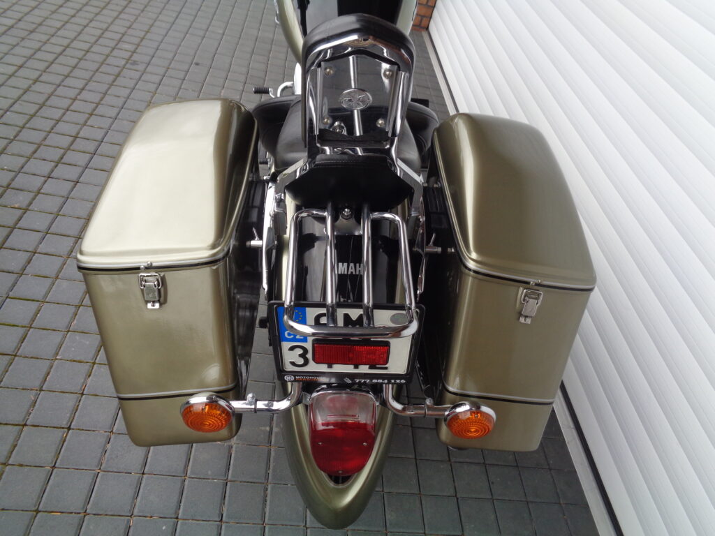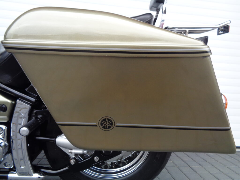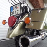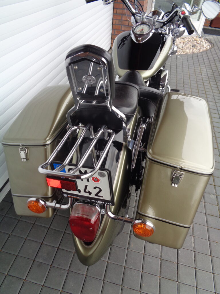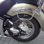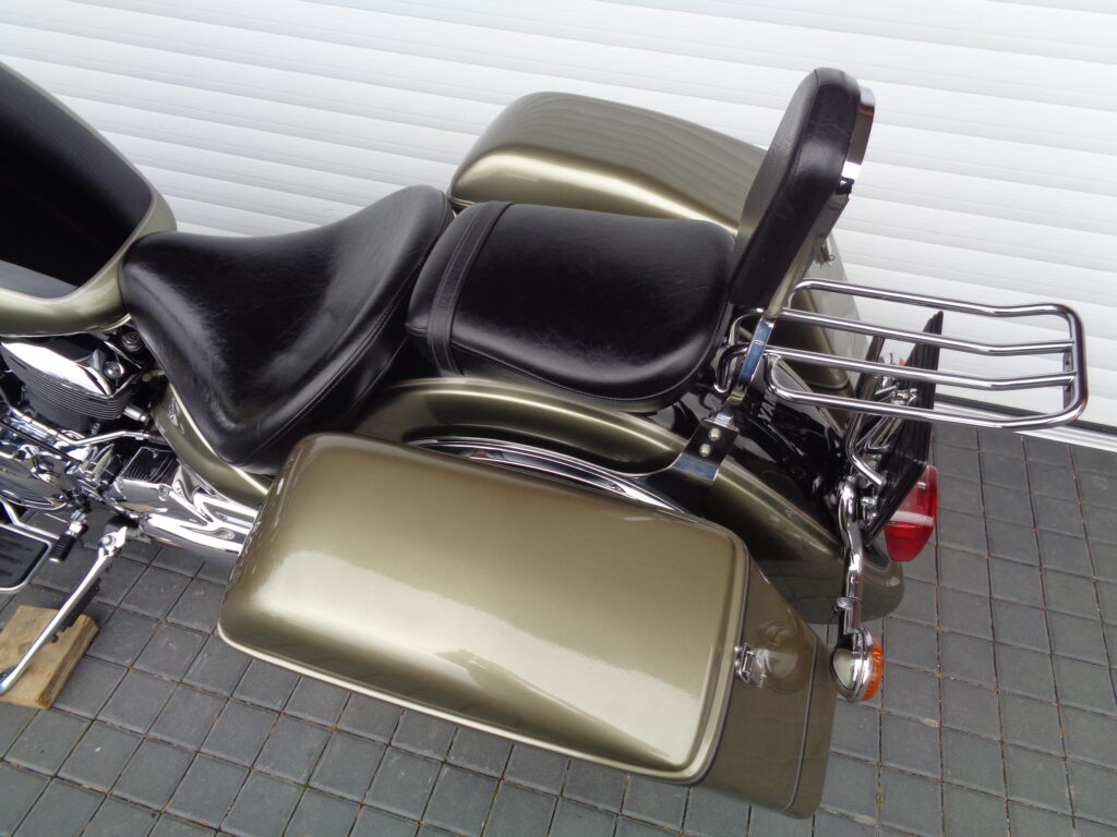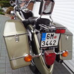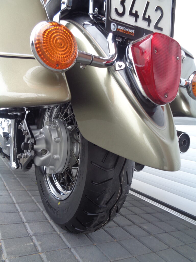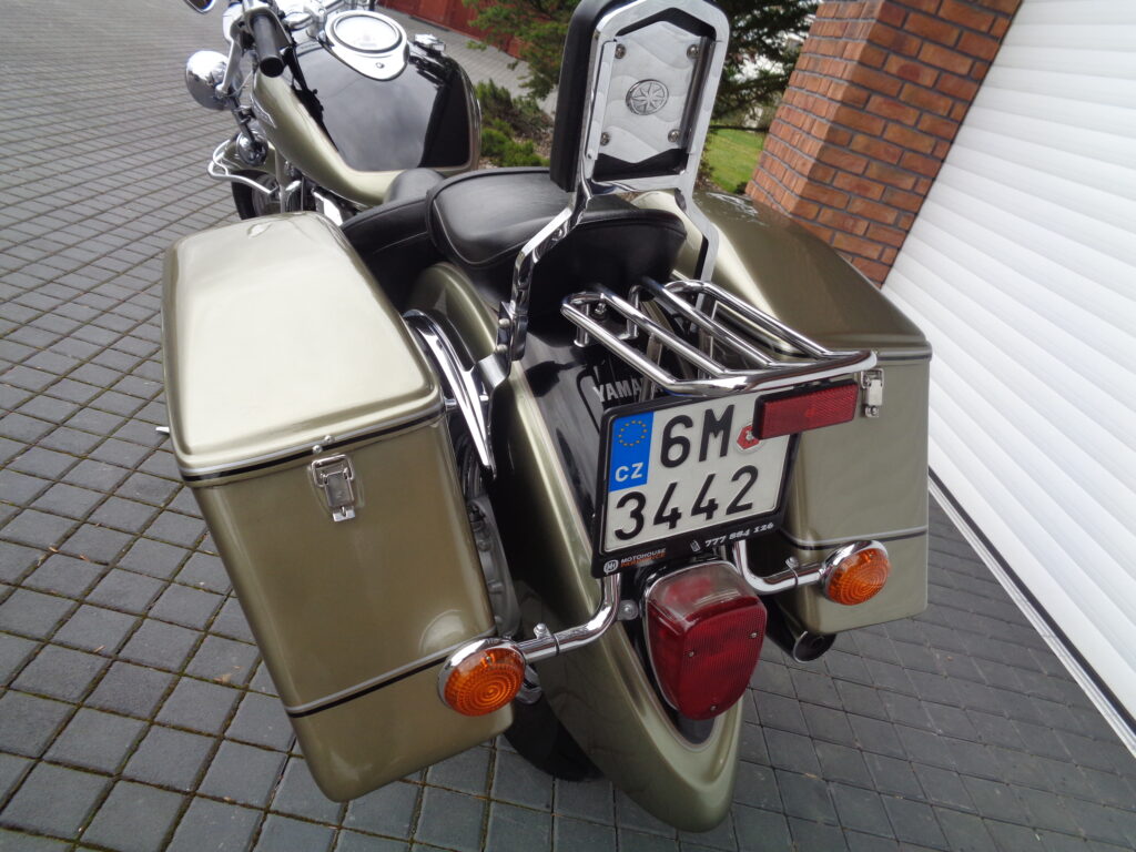 VÝBAVA: chromovaný rám předního blatníku, přídavná světla, originál plexi štít – výškově stavitelný, přední padací rámy, rychloupínací skořepinové kufry v barvě – zamykatelné + zamykatelné k motu – 2x klíč. Dále opěrka spolujezdce s nosičem, okrasné kryty rámu, značkový laděný výfuk – hluboký dunivý zvuk, / přední svod shodný pro oba výfuky /, stínítko hl. světla, přidám značkový elektronický zámek na kotouč +nový zámek kufru … .
